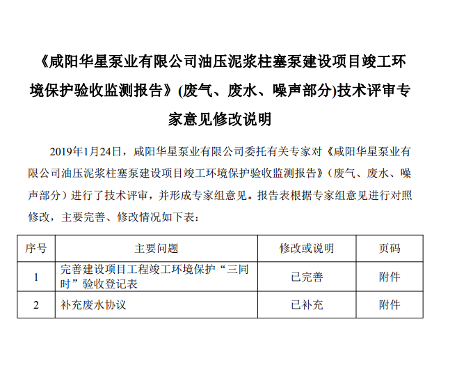 6《咸陽華星泵業(yè)有限公司油壓泥漿柱塞泵建設(shè)項目竣工環(huán)境保護驗收監(jiān)測報告》廢氣、廢水、噪聲部分修改說明